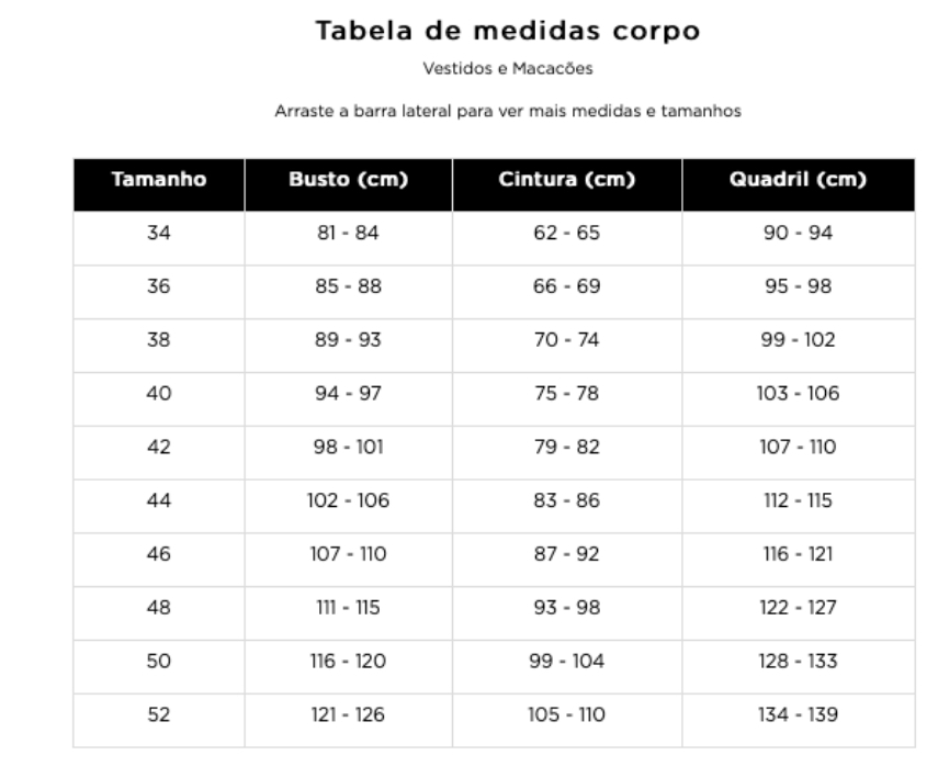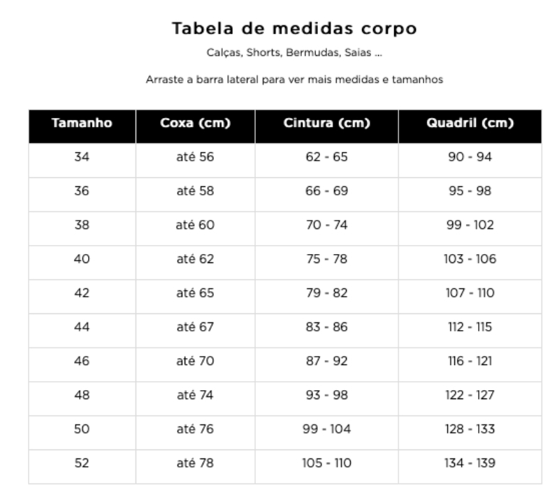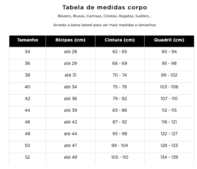 Depois de medir, anote cada valor e compare com a nossa tabela de medidas. No site, cada peça possui uma tabela específica para indicar qual tamanho escolher com base nas suas medidas. Assim, suas chances de acertar na escolha aumentam muito – ficou bem fácil, né?